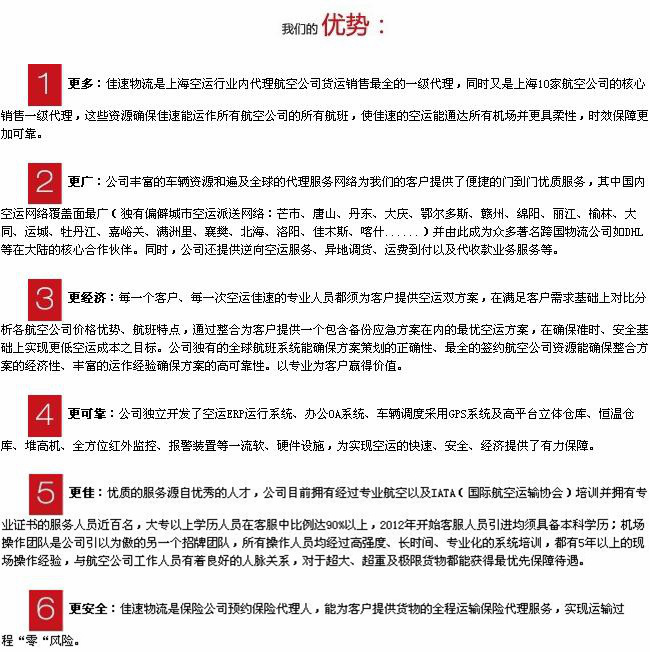 航空货运是佳速物流的主打品牌模块,佳速物流是中国交通部、中国航空运输协会指定空运销售一级代理企业,同时也是国际航空(CA)、东方航空(MU)、南方航空(CZ)、厦门航空(MF)、海南航空(HU)、深圳航空(ZH)、山东航空(SC)、春秋航空(9S)、吉祥航空(HO)、上海航空(FM)的核心空运代理。