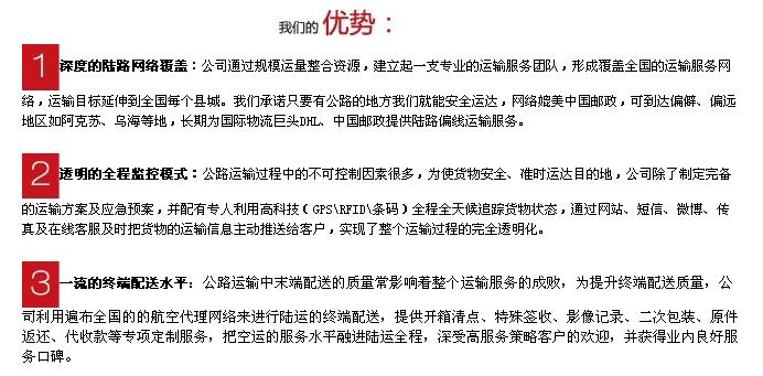 为小批量、多批次的货物提供时效为27天的标准公路运输服务,可以运输到中国所有有公路的地方。
