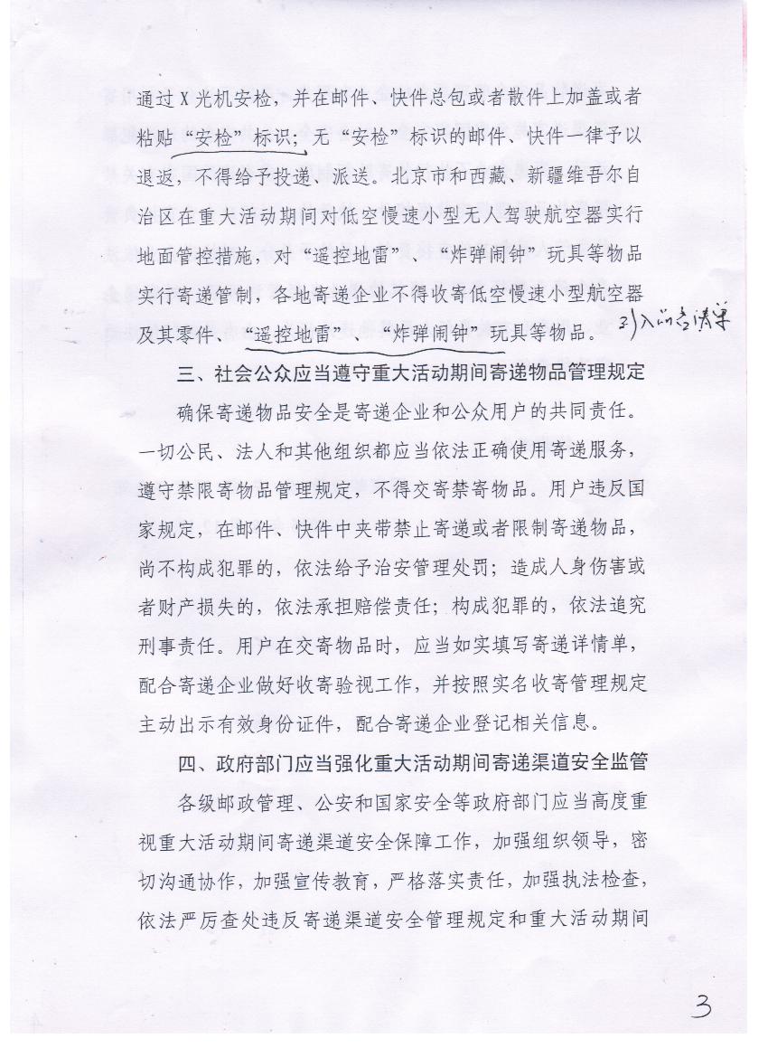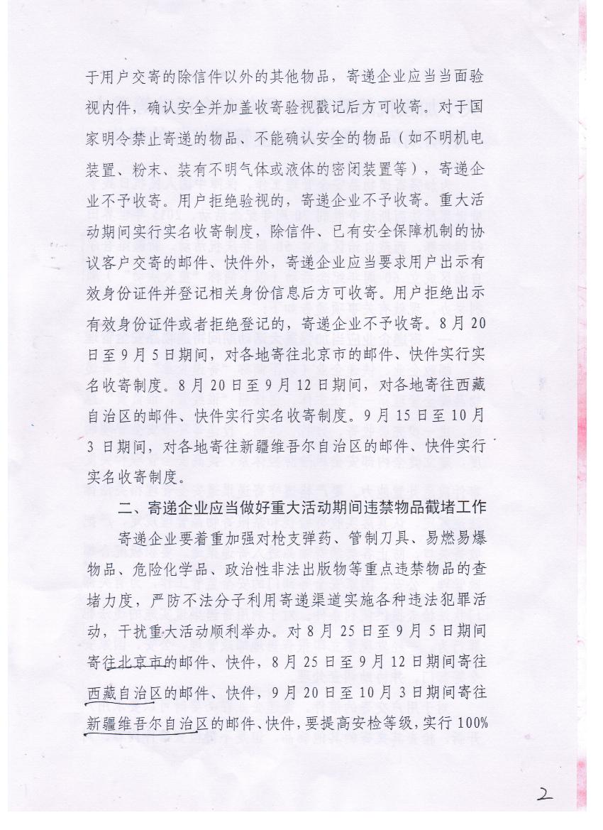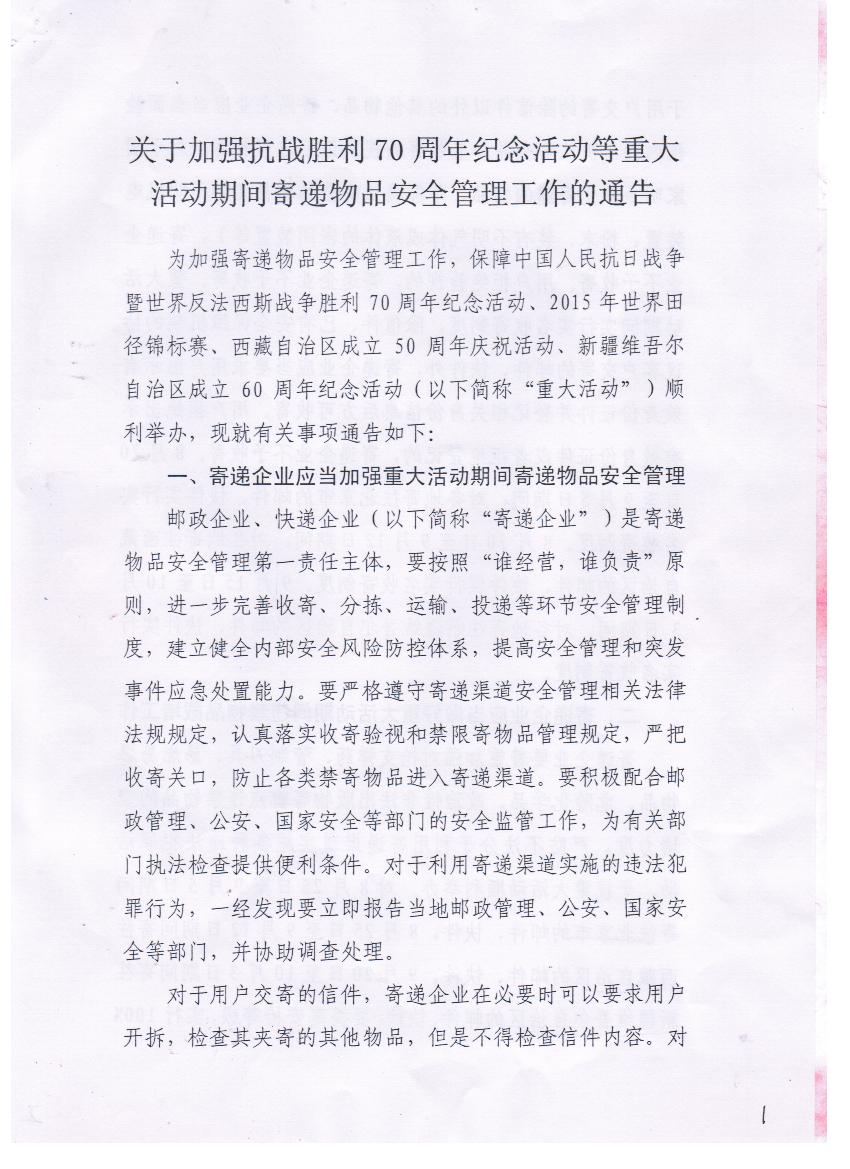 关于加强抗战胜利70周年重大活动期间寄递物品安排管理通告