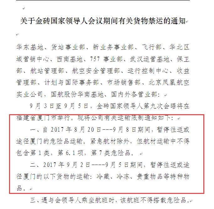 关于金砖国家领导人会议期间有关货物禁运的通知